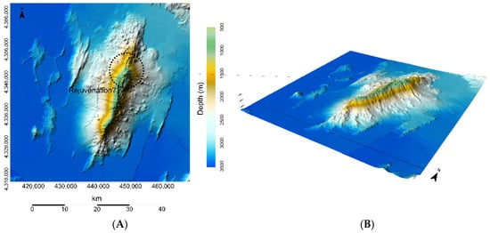 A bathymetric map of the SE Tyrrhenian Sea was created by joining high-resolution multibeam data with the lower resolution data provided by the European Marine Observation and Data Network (EMODnet) [52]. High-resolution multibeam data (Palinuro and Marsili volcanic chains) were collected by using a Reson Seabat 8160 multibeam sonar system, which is effective at depths ranging from 50 to 3500 m. This system is integrated with differential global positioning and characterized by a 50 kHz ping source, 150° beamwidth for the transmitted pulse, and a 126-beam receiver. The sound velocity in seawater was measured using a sound velocimeter profile, with real-time recordings and updates made every 8 h during data acquisition. Data were processed with partial, real-time beam filtering, swath and spatial mode editing, despiking, and digital terrain model (DTM) rendering. The final DTM is reported with a 20 m grid cell size (Figure 3).