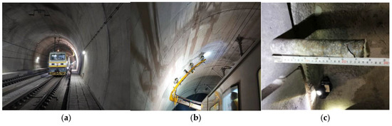 High-speed railway (HSR) tunnels play a critical role in modern transportation infrastructure, enabling rapid, large-volume, and energy-efficient mobility across vast regions. As operational demands increase, the construction of super-large-span tunnels—particularly single-bore four-track configurations—has become necessary to accommodate growing traffic and limited underground space [1,2]. However, railway tunnels are highly susceptible to both construction-related defects and operational degradation over time. Among these, lining thinning and voids have been frequently observed [3,4,5], as shown in Figure 1. Given the structural scale and functional importance of four-track HSR tunnels, accurately assessing the mechanical implications of thinning defects has become a critical technical challenge—yet remains insufficiently addressed in current engineering practice.