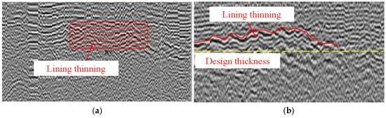Radar images of lining thinning defects: (a) defect 1; (b) defect 2.