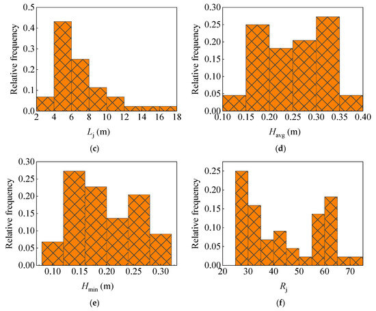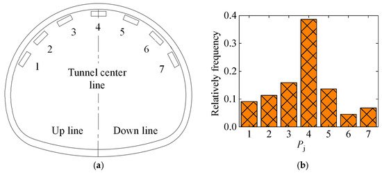 Seven survey lines were established for the defect investigation, as shown in Figure 4a. The spatial parameters of the thinning defects—namely, the defect position within the cross-section (Pj), defect length (Lj), average thickness (Havg), minimum thickness (Hmin), and the thinning–thickness ratio (Rj)—are presented in Figure 4b–f. Here, the thinning–thickness ratio Rj is defined as the ratio of the average lining thickness (Havg) after thinning to the designed lining thickness (Hdes). Thinning defects were most frequently observed at the vault (corresponding to survey line 4), accounting for 38.64% of all cases. The remaining defects were more evenly distributed, with proportions ranging from 6.82% to 15.91%. In terms of defect length, the most common range was 4–6 m (43.18%), followed by 6–8 m (25.00%). The maximum observed defect length was 17.0 m. Regarding the average thickness, 90% of thinning defects fell within the range of 0.175 to 0.325 m, with the minimum average thickness recorded as 0.15 m. For minimum thickness values, 84.11% were between 0.14 and 0.26 m, with the lowest value observed being 0.09 m. The thinning–thickness ratio Rj was most commonly in the range of 0.275 to 0.325 (40.9%), with the lowest recorded value being 0.25. These findings indicate the presence of severe thinning defects in the surveyed railway tunnels.
