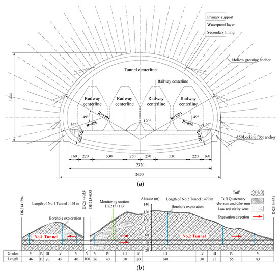 The XBS Tunnel of the Hangzhou–Shaoxing–Taizhou (HST) railway consists of Tunnel 1 and Tunnel 2, with lengths of 166 m and 430 m, respectively. Considering factors such as track merging near stations, the tunnel was designed as a single-bore four-track tunnel—the first of its kind in China. With a span ranging from 26.3 m to 27 m and a burial depth of 7–53 m, it represents a rare example of a super-large-span tunnel. The tunnel portal section passes through silty clay and tuff with well-developed joints and fractures, resulting in extremely fragmented rock masses classified as Grade V rock [16]. The main tunnel alignment traverses tuff formations, predominantly of Grades IV and V. Based on engineering analogy and geological conditions, a composite support system of “advanced support + double-layer primary support + secondary lining” was adopted for the XBS Tunnel, as illustrated in Figure 5. The construction site is shown in Figure 6. The XBS four-track HSR tunnel has been in operation since January 2022 and is currently performing well.