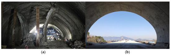 Construction site of the XBS Tunnel: (a) temporary support removal; (b) completion of secondary lining casting.