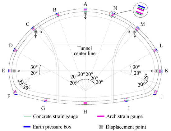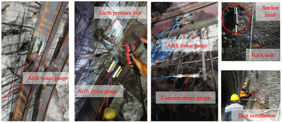 Field monitoring of the XBS four-track HSR tunnel was conducted over a period of more than eight months from February to November 2019. The monitoring program included observations of rock deformation, deformation of the support structure, contact pressure between the rock and the primary support, stresses in steel arch frames, stresses in lattice girders, concrete stress within the primary support, and concrete stress in the temporary support. A selection of monitoring instruments is summarized in Table 1. The layout of monitoring points is shown in Figure 7, and the on-site monitoring setup is presented in Figure 8.
