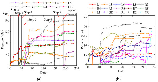 Rock pressure curves: (a) DK215+105; (b) DK215+142.