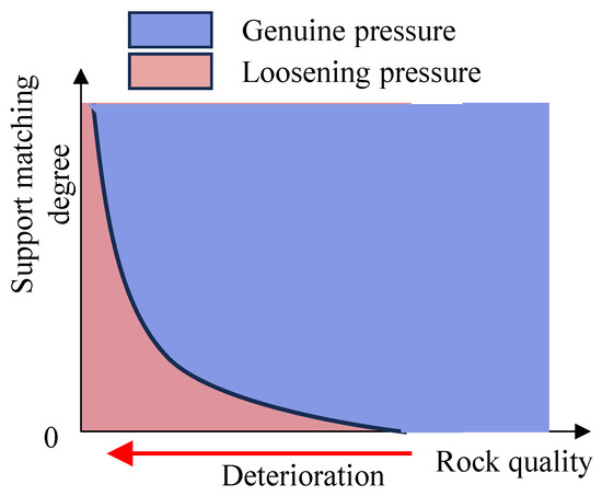 Rock pressure refers to the force exerted on the surrounding rock and support structures during underground excavation, which may lead to deformation or structural failure. Loosening pressure is defined as the load directly imposed on the support structure by detached or collapsed rock masses under the influence of gravity. Genuine pressure occurs when the deformation of the surrounding rock is restrained by closely fitting support systems, leading to a coordinated deformation and load-sharing mechanism between the rock mass and the support. In this context, the rock exerts contact pressure on the supporting structure. With the advancement of tunneling techniques, construction philosophies, support systems, and modern monitoring technologies, the concept of rock pressure in conventional railway tunnels has evolved—from the traditional loosening pressure to what is now termed genuine pressure. Based on field monitoring during the construction of the Zhengzhou–Wanzhou HSR tunnel, Wang et al. [21] determined that the rock pressure in mechanically excavated tunnels corresponded to loosening pressure. The continuous evolution of tunnel engineering practices is expected to reinforce this transformation. It can be concluded that the primary direction in current tunnel engineering is to control the rock pressure within the genuine pressure stage, as illustrated in Figure 10. Based on the compatibility between the tunnel lining and rock, as well as the rock mass quality, this study proposes a conceptual diagram of tunnel bearing states (Figure 11). Assuming the tunnel is initially in a genuine pressure state (point A) upon completion, then if the rock deteriorates, the tunnel may shift to a loosening pressure state (point B). If the lining itself deteriorates, the bearing state may evolve to point C. When both the lining and rock undergo simultaneous degradation, the tunnel’s load-bearing state may reach point D.
