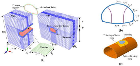 Numerical model of an HSR tunnel with thinning defects: (a) Overall model geometry. (b) Thinning position numbering. (c) Classification of thinning-affected and active thinning zones.