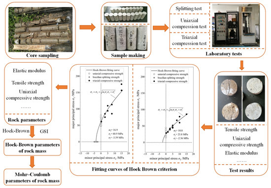 The thinning defect of the tunnel lining was modeled as a sector-shaped body characterized by three key parameters: the thinning length, the thinning–thickness ratio, and the thinning arc length. The mechanical parameters of the tuff were obtained through field sampling and laboratory testing conducted at the XBS Tunnel site. The method used to determine the rock mass parameters is illustrated in Figure 13. The parameters adopted for the numerical simulation are summarized in Table 4.