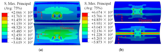 According to the railway tunnel design code [16], the flexural tensile strength of C30 concrete is 0.55 MPa. The simulation results show that the maximum principal stresses caused by thinning defects significantly exceed this allowable stress, indicating that tensile failure has likely occurred and cracks have already developed in the lining. The load-bearing capacity of the active thinning zone is weakened, and the load originally carried by the thinned lining is redistributed to the adjacent lining in the thinning-affected zone, resulting in stress concentrations in both zones. Furthermore, due to the presence of thinning defects, the load that would otherwise be directly transmitted to the secondary lining is instead redistributed through the adjacent primary lining. This increases the load transfer demand within the thinning-affected zone, leading to stress concentration, especially on the inner side of the lining within this zone.