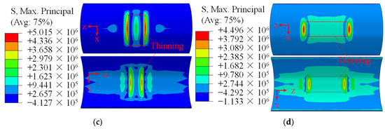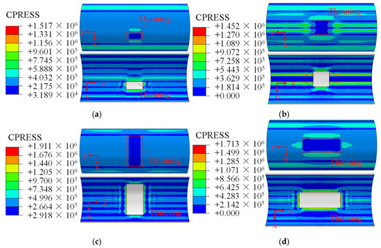 The stress distribution in the tunnel lining under the influence of thinning defects is illustrated in Figure 18, based on engineering conditions with a burial depth of 34 m and Grade IV rock. The defect parameters are identical to those presented in Figure 14. On the outer side of the lining, the contact pressure between the lining and rock within the active thinning zone is significantly reduced, with localized contact failure observed in some areas. This indicates that the thinning defect weakens the interaction between the lining structure and the rock. Additionally, increased contact pressure is observed at the edges of the thinning zone, suggesting a stress redistribution wherein the edge regions bear a larger portion of the load. On the inner side, the primary lining completely loses contact with the secondary lining within the active thinning zone. In the thinning-affected zone, contact is maintained but becomes markedly non-uniform. The peak contact pressure is observed at the edge of the thinning zone on the inner lining surface, reaching 1.517 MPa, 1.452 MPa, 1.911 MPa, and 1.713 MPa under the defect scenarios shown in Figure 18a–d, respectively. Areas of poor contact may become potential sites for lining cracking or water ingress. The thinning defect significantly reduces the contact stiffness and force-transfer efficiency between the lining and the rock or secondary lining. This weakens the rock’s supporting function and exacerbates stress and deformation concentration in the lining, posing substantial risks to the long-term structural integrity and operational safety of the tunnel.