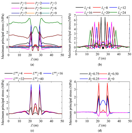 Principal stress curves: (a) effect of Pj; (b) effect of Lj; (c) effect of Larcj; (d) effect of Rj.