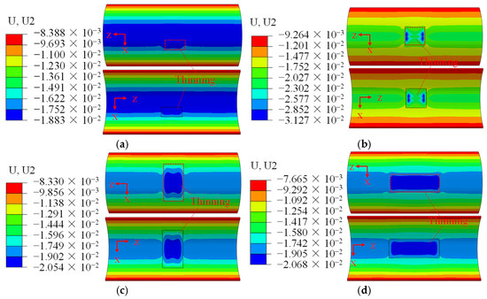 The stress distribution in the tunnel lining under the influence of thinning defects is shown in Figure 16, with the defect parameters identical to those in Figure 14. Thinning defects lead to significant settlement within the active thinning zone of the tunnel lining. The deformation contour plots reveal distinct elliptical or rounded-rectangle-shaped subsidence zones in the vicinity of the thinning region. Thinning defects cause pronounced vertical settlement within the active thinning zone of the tunnel lining. The deformation contour maps exhibit distinct elliptical or rounded-rectangular subsidence zones surrounding the thinning region. Under the thinning condition shown in Figure 16a, the maximum vertical settlement within the active thinning zone reaches 18.83 mm. For the case in Figure 16b, the peak settlement is also located within the active thinning zone, reaching 31.27 mm. In Figure 16c, the maximum settlement of 20.54 mm appears at the center of the thinning defect located at the vault. Similarly, in Figure 16d, the settlement peaks at the center of the active thinning zone, reaching 20.68 mm.