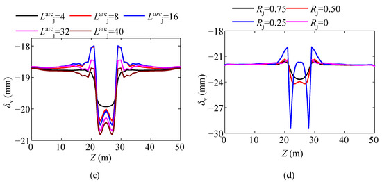 Structural deformation cloud maps: (a) Pj = 2, Larcj = 4 m, Lj = 8 m, Rj = 0.50; (b) Pj = 1, Larcj = 8 m, Lj = 8 m, Rj = 0.25; (c) Pj = 1, Larcj = 16 m, Lj = 8 m, Rj = 0.50; (d) Pj = 1, Larcj = 8 m, Lj = 20 m, Rj = 0.50.