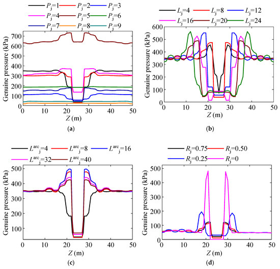 Genuine pressure distribution curves: (a) effect of Pj; (b) effect of Lj; (c) effect of Larcj; (d) effect of Rj.