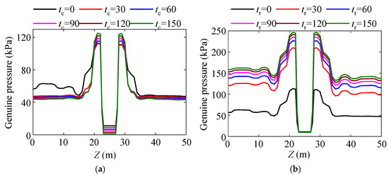 The genuine pressure distribution in shallow four-track HSR tunnels with thinning defects under conditions of lining or rock mass degradation is shown in Figure 20. The operational service times considered include 30, 60, 90, 120, and 150 years. When the tunnel lining deteriorates, the maximum genuine pressure increases with service time. At tc = 0, the maximum genuine pressure is 112.67 kPa; when tc = 150 years, it increases to 124.91 kPa—an increase of 10.86%. When only the rock deteriorates, a similar increasing trend is observed. At tr = 150 years, the maximum genuine pressure reaches 246.28 kPa, representing an increase of 118.59 kPa compared to the initial state. When both the rock and the lining deteriorate simultaneously in the presence of a thinning defect, the genuine pressure rises further with time. At tr = tc = 150 years, the maximum genuine pressure reaches 262.16 kPa, reflecting a total increase of 132.69 kPa. In summary, as service time increases, the degradation of the lining and rock significantly exacerbates stress concentration within the thinning-affected zone, potentially resulting in severe structural damage. Moreover, such degradation may cause the tunnel to transition from a genuine pressure state to a loosening pressure state, with the secondary lining shifting from a safety reserve to a primary load-bearing structure. Therefore, in shallow four-track HSR tunnels, early identification and timely remediation of lining defects are essential to ensure long-term operational safety.