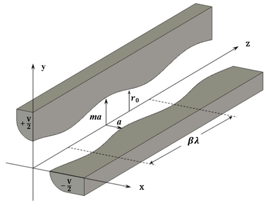 In the RFQ, the beam is focused transversely by RF electric quadrupole fields and accelerated by longitudinal RF electric fields. In the RFQ, the formation of the electric field depends on the electrode geometry. The schematic structure of the RFQ is illustrated in Figure 1, where a is the minimum radial aperture, m is the modulation parameter, is the maximum aperture, is the average aperture, V is the voltage, is the modulation period, where represents the relativistic speed, and is the RF wavelength. Each modulation period includes two cells, and the length of each cell is . By applying voltages of to adjacent electrodes, an RF electric quadrupole field is generated, providing transverse focusing for the beam. In addition, a longitudinal accelerating field is produced along the beam axis by introducing periodic modulation of the electrode geometry, enabling efficient acceleration.