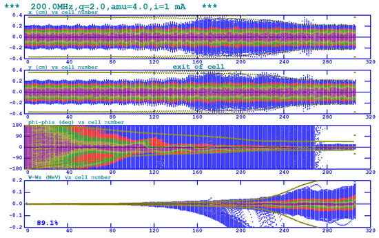 The design parameters are illustrated in Table 2. In this design, the constant focusing strength factor 4.2, the voltage of 70 kV, and the synchronous phase range from to were adopted. The choice of these parameters was based on the operational experience of currently well-performing medical accelerators: the Heavy Ion Medical Machine (HIMM) [18], the Heavy Ion Medical Accelerator in Chiba (HIMAC) [31], and the Heidelberg Ion-Beam Therapy Center (HIT) [44]. The number of particles was set to 10,000 with a 4D water-bag distribution [45]. The beam dynamics simulation results are shown in Figure 2 and Figure 3.