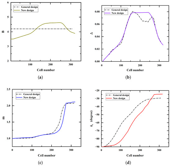 Comparison of parameters between the general design and the new design along the RFQ. (a) Focusing strength factor B. (b) Defocusing factor . (c) Modulation parameter m. (d) Synchronous phase .