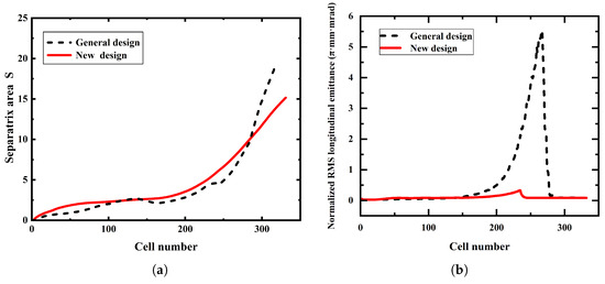 Comparison results between the general design and the new design. (a) Area of the separatrix. (b) Longitudinal emittance growth (color online).