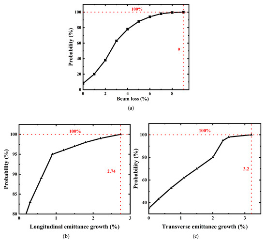 Cumulative probability distribution graph of the results for the mechanical error. (a) Extra beam loss. (b) Longitudinal emittance growth. (c) Transverse emittance growth.