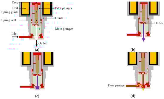 The ultra-high-pressure hydrogen solenoid valves discussed in this study employ a pilot-operated mechanism. This design is crucial for high-pressure applications as it allows for the control of large flow rates with a relatively small solenoid actuation force. Directly actuating a large main plunger against high inlet pressures would require an impractically large and power-consuming solenoid. The pilot stage effectively reduces the actuation force needed for the main stage. The operational sequence, as illustrated in Figure 1, consists of several distinct stages [16]: