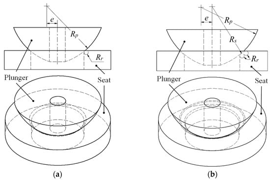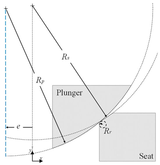 Hertzian contact theory provides a fundamental model for quantitatively describing stress distribution and deformation characteristics occurring during contact between curved surfaces. The mathematical formulations presented in this section (Equations (1)–(8)) are based on classical Hertzian contact theory, as presented in comprehensive references [17,18]. These established relationships form the theoretical foundation upon which our contact geometry analysis is built. In the concave contact geometry, initial contact occurs between the curved surface of the plunger (Rp) and the edge rounding of the seat (Rr). The equivalent radius of curvature (Req) at this initial contact stage is defined as follows: