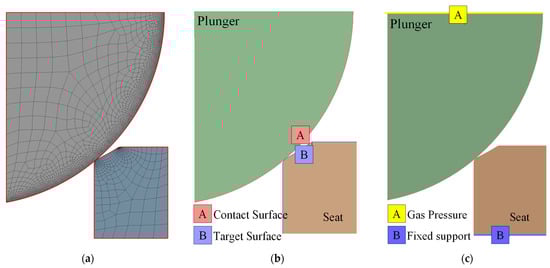 The finite element model, including mesh details, contact definition, and applied boundary conditions, is illustrated in Figure 5. As shown in Figure 5a, the mesh was significantly refined in the critical contact area between the plunger and seat, with a minimum element size of approximately 4.29 µm. An average element quality metric of 0.93 was maintained. This level of mesh refinement and element quality in the critical contact zone is considered sufficient to yield reliable stress and contact pressure results for the geometries analyzed.
