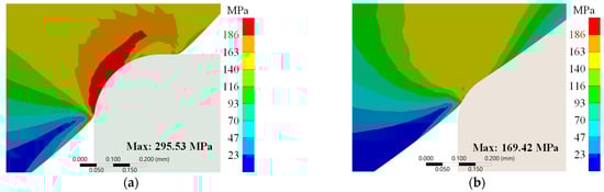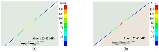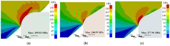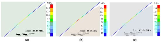 Equivalent stress distribution at 87.5 MPa: (a) rectangular contact geometry; (b) concave contact geometry (Rp > Rs); (c) concave contact geometry (Rp < Rs).