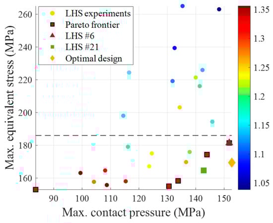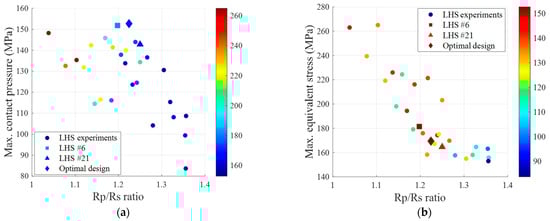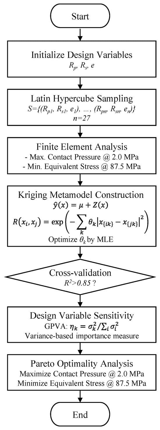The design was optimized using Latin hypercube sampling with 27 systematically distributed points to efficiently explore the three-dimensional design space. The kriging metamodel constructed from these simulations demonstrated high prediction accuracy (R2 > 0.88) for both performance metrics. Pareto analysis identified optimal trade-offs between contact pressure and equivalent stress, revealing that an Rp/Rs ratio between 1.2 and 1.25 yields the optimal balance. The optimized geometry (Rp = 5.73 mm, Rs = 4.68 mm, e = 0.95 mm) with Rp/Rs = 1.22 achieved 23.7% higher contact pressure at 2.0 MPa and 42.7% lower maximum equivalent stress at 87.5 MPa, improving the safety factor from 0.63 to 1.10.