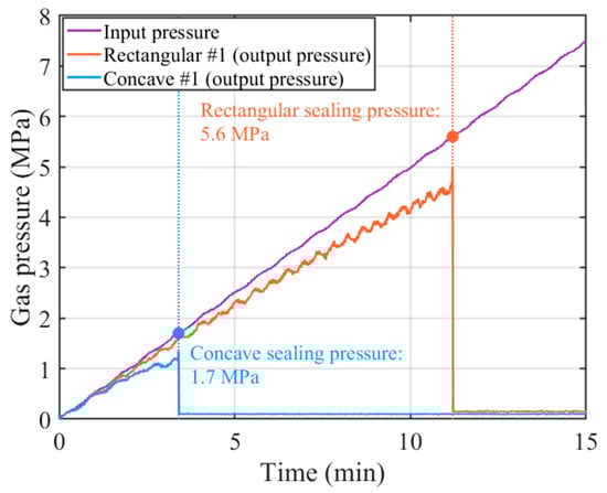 Experimental validation of sealing performance revealed significant differences between rectangular and concave contact geometries. Figure 15 illustrates the comparative sealing behaviors of both designs across the operating pressure range.