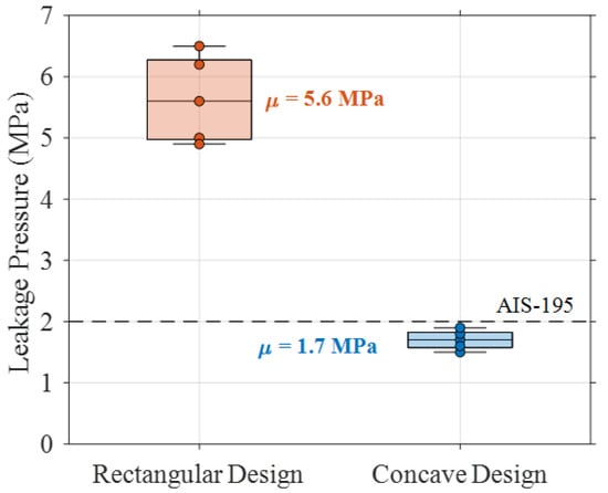 The horizontal reference line at 2.0 MPa represents the AIS-195 industry standard [24] for hydrogen control components in fuel cell vehicles. This standard specifies that effective sealing must be achieved at or below 2.0 MPa to ensure operational reliability and safety in hydrogen applications. The rectangular contact geometry exhibited sealing pressures ranging from 4.9 to 6.5 MPa, failing to meet the AIS-195 requirement, while the concave contact geometry achieved sealing between 1.5 and 1.9 MPa, successfully satisfying the standard’s specifications.