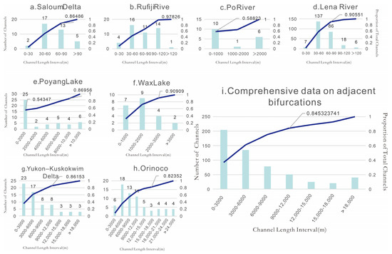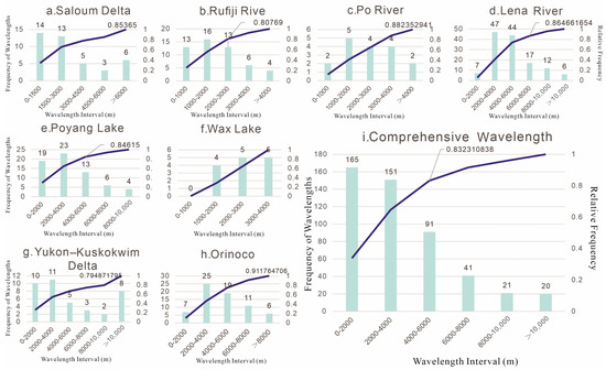 Figure 4a shows Saloum delta’s wavelength distribution, with 80% < 4500 m. Figure 4b displays Rufiji River’s 80% wavelengths < 3000 m (30% in 2000–3000 m). Figure 4c indicates Lena River’s 80% wavelengths < 8000 m (45% in 0–5000 m). Figure 4d shows Poyang Lake’s 80% wavelengths < 4000 m (54% in 0–2000 m). Figure 4e illustrates Yukon–Kuskokwim delta’s 80% wavelengths < 10,000 m. Figure 4f presents Orinoco’s 80% wavelengths < 6000 m (36% in 2000–4000 m). Figure 4g shows Wax Lake’s 80% wavelengths < 4000 m. Figure 4h displays Po River’s 80% wavelengths < 4000 m (59% in 0–1000 m).