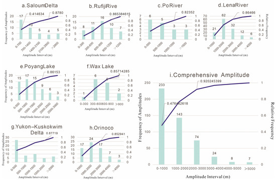 Figure 5a shows Saloum delta’s 80% amplitudes < 2800 m (41% < 700 m). Figure 5b displays Rufiji River’s 80% amplitudes < 1200 m. Figure 5c indicates Lena River’s 80% amplitudes < 3000 m (46% in 1000–2000 m). Figure 5d shows Poyang Lake’s 80% amplitudes < 2000 m. Figure 5e illustrates Yukon–Kuskokwim delta’s 80% amplitudes < 3000 m. Figure 5f presents Orinoco’s 80% amplitudes < 3000 m (35% in 1000–2000 m). Figure 5g shows Wax Lake’s amplitude distribution. Figure 5h displays Po River’s 80% amplitudes < 1500 m.