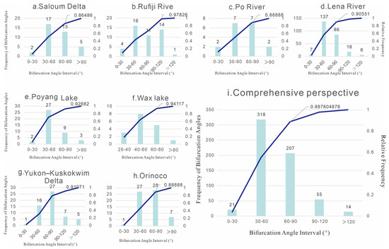 In deltas such as Wax Lake, Kotlik, Lena River, Po River, Poyang Lake, and Orinoco, 80% of bifurcation angles concentrate below 90°, with Poyang Lake (65%) and Lena River (53%) showing the highest proportions in the 30–60° interval (Figure 7). This reflects that braided channels primarily bifurcate at moderate angles, corresponding to a depositional environment with balanced hydrodynamic energy and frequent channel migration, where sandbodies are mostly distributed in network or dendritic patterns. Moderate bifurcation angles (30–60°) commonly develop in gentle-slope settings, such as the Poyang Lake delta, where stable hydrodynamic conditions promote moderate channel bifurcation, forming dendritic sandbar complexes [32].