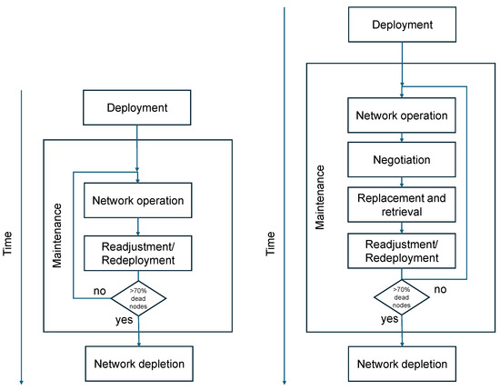 In mobile WSNs, the deployment phase is carried out by a set of mobile nodes: vehicles, specialized workers, or mobile robots. The mobile nodes aim to reach maximum coverage by determining optimal positions according to different algorithms. Once the network is deployed, the network operates routing traffic and during this phase, the necessary adjustments must be performed to keep the network operational for as long as possible while maintaining the connected coverage. However, over time, the number of degraded nodes increases, which can lead to such a large number of inoperable nodes that the network is considered to be depleted and reach the end of its operational life.