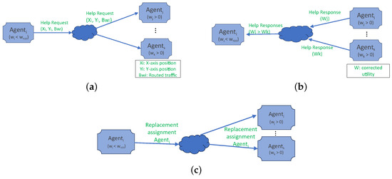 A negotiation round is triggered when an agent reaches a willingness value of −1, that is, critically close to depletion. This is accomplished by sending a message through the network asking for help (Figure 3a). Robots with positive willingness answer to this request by replying back with their disposition to help (Figure 3b). Other agents with negative willingness, but not higher than 20% on top of , stated as , also send their request to be replaced. In this way, not only critical robots are replaced, but also a fraction of them that are becoming close to that level.