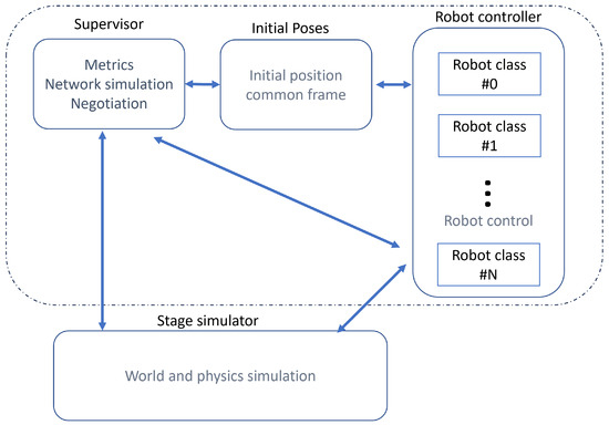 Table 2. CPU and memory usage for 100 and 200 robots. Test machine specifications: Intel Core i7 12700K, 32 GB RAM, Ubuntu 22.04. Ten Robot controllers with 10/20 robots, respectively. - Supervisor. The supervisor is a simulation mechanism the purposes of which comprise the launching of the deployment phase, the networking simulation, and the negotiation protocol (as right now it is centralized, and only when it applies). Additional tasks the supervisor carries out are those related to metrics collection and visualizing robot positions.