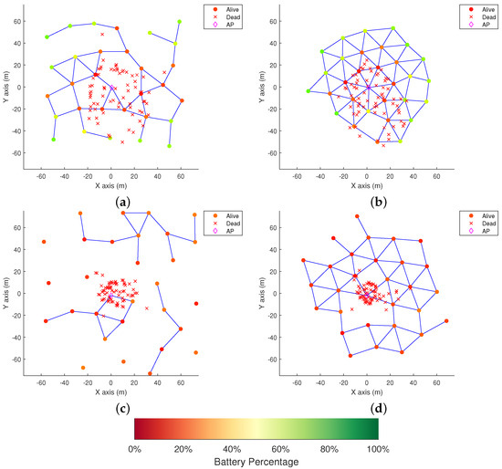 According to the routing protocol previously explained, robots with higher energy demands become the first to run out of battery (due to their more intense traffic routing, usually those who are closer to the sink). If the SPF-only strategy is chosen, those nodes continue operating at their place until their depletion, possibly creating a hole in the network between the sink and the further nodes. To avoid this, after each network simulation round, a redeployment is effectuated in order to make the network more compact. In the case of Agents, redeployments are performed without necessarily making the network more compact. This is due to the intelligent negotiation algorithm, which aims to maintain maximum connectivity while extending network lifespan.