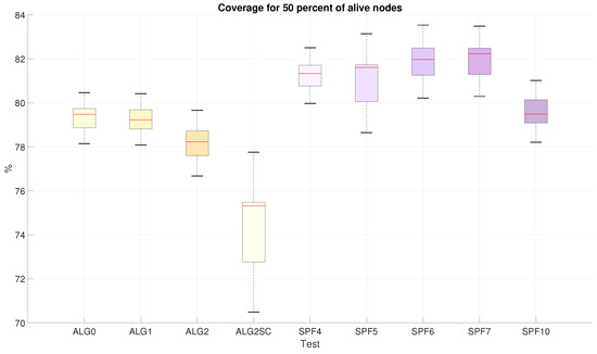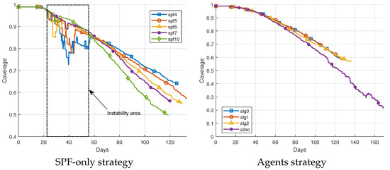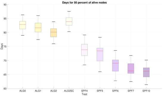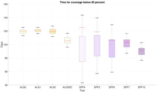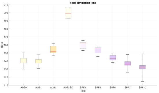 Lastly, if the network lifetime is to be decided between the tests that are proven to be stable, a comparison is made in Figure 10. The blackouts in coverage and the instability present in spf4, spf5, spf6, and alg2sc, as shown in Figure 6, might discard this metric as a valid result (because of the reasons explained at the beginning of this section). This fact sets Algorithms 0, 1, 2, and the SPF-only strategy with cohesion 7 and 10 as the remaining tests to be compared. The latter approach, even with temporary blackouts and greater uncertainties than the Agents, represent lower lifetimes with median values below 140 days. The similarities among the Agents result in a distinction favoring Algorithm 2 regarding final lifespan. This value is expected due to the optimality that this negotiation algorithm represents.