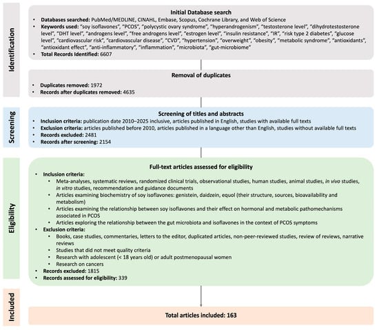We conducted a computerised search using the electronic databases PubMed/MEDLINE, CINAHL, Embase, Scopus, Cochrane Library, and Web of Science. Research was conducted using English-language meta-analyses, systematic reviews, randomised clinical trials, and observational studies from all over the world. The literature review was performed up to April 2025. The following terms related to hormonal and metabolic mechanisms were linked to the phrases “soy isoflavones” and “PCOS” OR “polycystic ovary syndrome”: “hyperandrogenism”, “testosterone level”, dihydrotestosterone level” OR “DHT level”, “androgens level”, “free androgens level”, “oestrogen level”, “insulin resistance” OR “IR”, “risk type 2 diabetes”, “glucose level”, “cardiovascular risk”, “cardiovascular disease” OR “CVD”, “hypertension”, “overweight” OR “obesity”, “metabolic syndrome”, “antioxidants”, “antioxidant effect”, “anti-inflammatory”, “inflammation”, “microbiota” OR “gut–microbiome”. The search was supplemented by using the names of the main soy isoflavones: genistein, daidzein, and the metabolite of daidzein: equol. The literature search and study selection were conducted independently by three researchers (IM, MZ, and AD). Discrepancies were resolved through discussion.