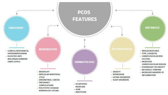 Polycystic ovary syndrome is a disease that is one of the most common causes of female infertility [80]. It is estimated that PCOS affects 10–13% of women of reproductive age if the diagnosis is based on the Rotterdam criteria, and the incidence rate is steadily increasing [1,2,3,4,5]. PCOS, frequently, in addition to hormonal and typically related to the reproductive system, can be accompanied by numerous metabolic and systemic disorders, such as tissue insulin resistance (IR), cardiovascular diseases (CVD), chronic inflammation, dermatological and psychological symptoms, and intestinal dysbiosis [1,17,18,19,20,21,22,23,24,81,82,83,84,85,86]. The characteristic PCOS features and associated disorders of the various systems are shown in the figure below (see Figure 3).