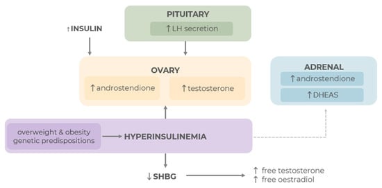 PCOS is not only an endocrine disorder but also a metabolic disorder. It is often associated with obesity (particularly the visceral phenotype), IR, secondary hyperinsulinemia, and dyslipidaemia. These factors increase the risk of developing metabolic complications and CVD and exacerbate the clinical and hormonal symptoms. They play an important role in the pathophysiology of PCOS [139,140,141].