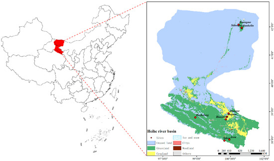 This study focuses on the Heihe River basin [21] in the northwestern part of China. The region is geographically located between approximately 98° E to 105° E and 37° N to 42° N, and is a typical inland river basin, as shown in Figure 1.