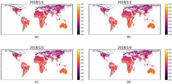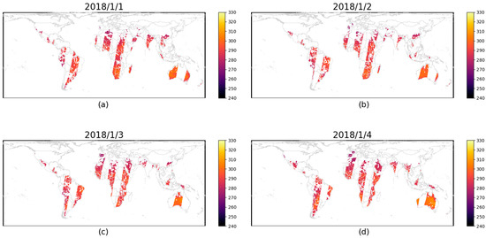 The map of PMW-LST after Singular Spectrum Analysis reconstruction on (a) 1 January 2018, (b) 2 January 2018, (c) 3 January 2018, and (d) 4 January 2018.
