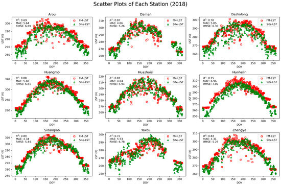 Scatter plot comparison of LST reconstructed using the RFRR machine learning model in 2018 with LST measured by AWS at 8 sites. FM-LST represents the fused LST predicted by the model; Site-LST represents the LST measured by the observation station.