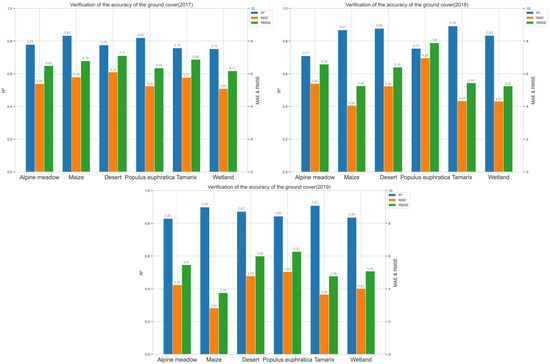 Bar chart of validation accuracy metrics (R2, MAE, RMSE) of FM-LST for different land cover types from 2017 to 2019.