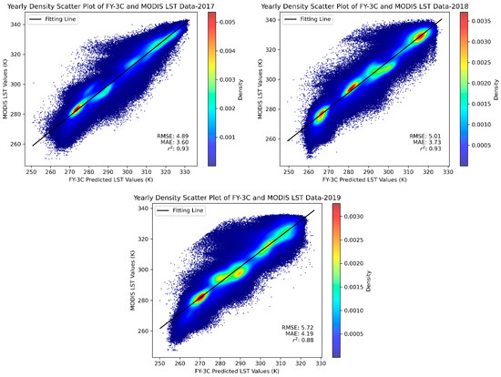 The 2017–2019 Annual Density Scatter Plots for MODIS and FMLST.