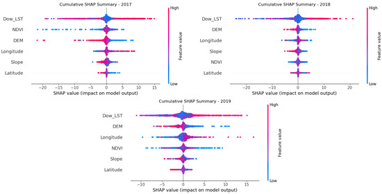 Specifically, the average SHAP value of Dow_LST in 2019 was around 10, significantly higher than 5 in 2017 and 8 in 2018, indicating that its influence on the model increased year by year. The impact of the DEM and NDVI remained relatively stable, with average SHAP values fluctuating between three and five. In contrast, geographically related features—latitude and longitude—contributed less to the model. For the NDVI, the average SHAP value in 2017 was around four, dropping to about two in 2018, which may reflect changes in climate conditions or vegetation growth patterns that year. By 2019, the influence of the NDVI had slightly increased. The DEM showed relatively consistent influence over the analysis period.