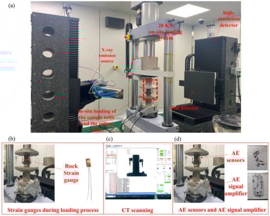 An indigenously developed continuous loading system was designed and fabricated for this investigation. The experiments were conducted in the nanoVoxel-4000 micro-CT facility (Tianjin Sanying Precision Instruments Co., Ltd., Tianjin, China) under ambient conditions (25 °C). The integrated system comprised (1) a servo-controlled loading actuator, (2) an acoustic emission (AE) monitoring module, and (3) a four-dimensional X-ray computed tomography (4D-XCT) imager (Figure 1). Key geometric and operational parameters are summarized in Table 2.