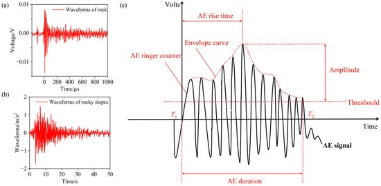 AE signal features derived from: (a) engineering-scale rock slope waveforms; (b) laboratory-scale sandstone waveforms; and (c) sandstone AE signal parameters.