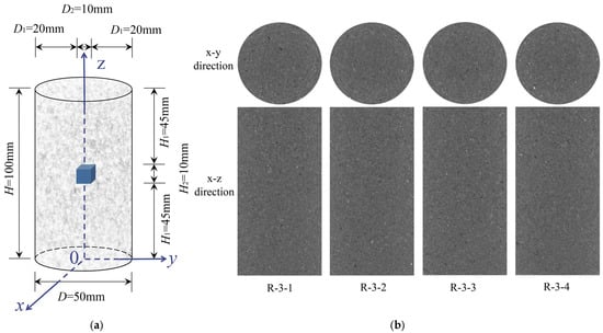 The progressive evolution of internal cracks in sandstone was non-destructively characterized through time-resolved 4D X-ray CT and synchrotron micro-CT imaging. The crack evolution–encompassing nucleation, initiation, propagation, and coalescence–was digitally reconstructed through Avizo 2020 software. Full CT scans of entire sandstone specimens (100 mm cylindrical samples), and the central region (10 mm cubic subsamples) of sandstone specimens are shown in Figure 3a. The azimuth map of the coordinate axes for scanning sandstone samples is shown in Figure 3a. The naturally collected sandstone specimens of Group 3 showed inherent heterogeneity. It can be seen from the physical and mechanical parameters of the sandstone samples from Group 3 (Table 1), and the two-dimensional CT images of the initial internal structure of the heterogeneous sandstone in Group 3 (Figure 3b).